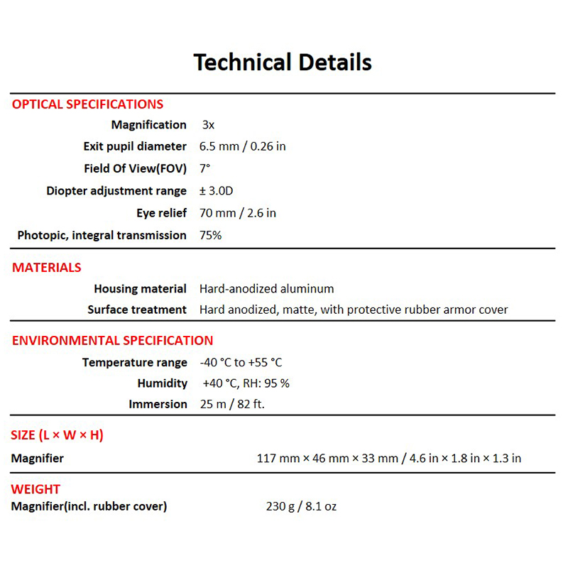 The 3XMag-1 magnifier is submersible up to 80 feet, fully shockproof, and can withstand temperatures ranging from -49°F to +160°F. The protective rubber cover provides the ideal ergonomic grip when used as a hand-held device. The 7-degree field of view (FOV) allows for a generous sight picture. A variable (-3 to +3) dioptric setting allows the magnifier to be adapted to the individual’s eye. This magnifier configuration is sold without a mount. The Aimpoint® TwistMount and FlipMount are the recommended mounting solutions and available separately through the Official Aimpoint store. Aimpoint magnifiers mount behind the Aimpoint sights eliminating the need for re-zeroing when shifting between non-magnified and magnified aiming.