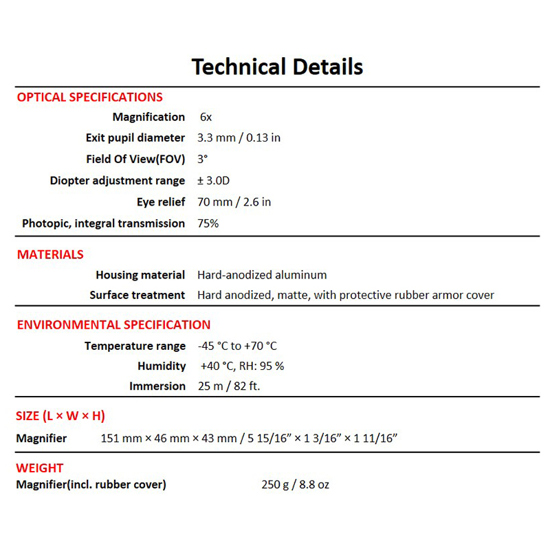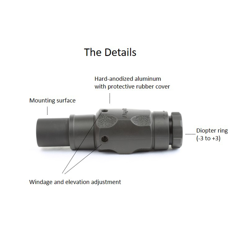 The 6XMag-1 magnifier is submersible up to 80 feet, fully shockproof, and can withstand temperatures ranging from -49°F to +160°F. The protective rubber cover provides the ideal ergonomic grip when used as a hand-held device. The 3-degree field of view (FOV) allows for a generous sight picture. A variable (-3 to +3) dioptric setting allows the magnifier to be adapted to the individual’s eye. This magnifier configuration is sold without a mount. The Aimpoint® TwistMount is the recommended mounting solution and available separately through the Official Aimpoint store. Aimpoint magnifiers mount behind the Aimpoint sights eliminating the need for re-zeroing when shifting between non-magnified and magnified aiming.
