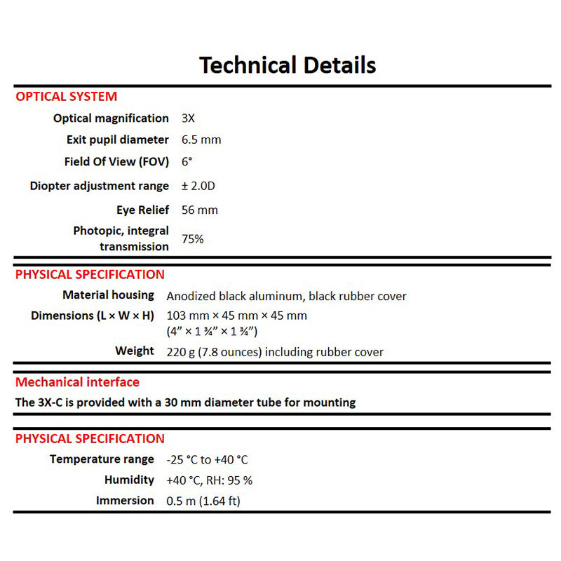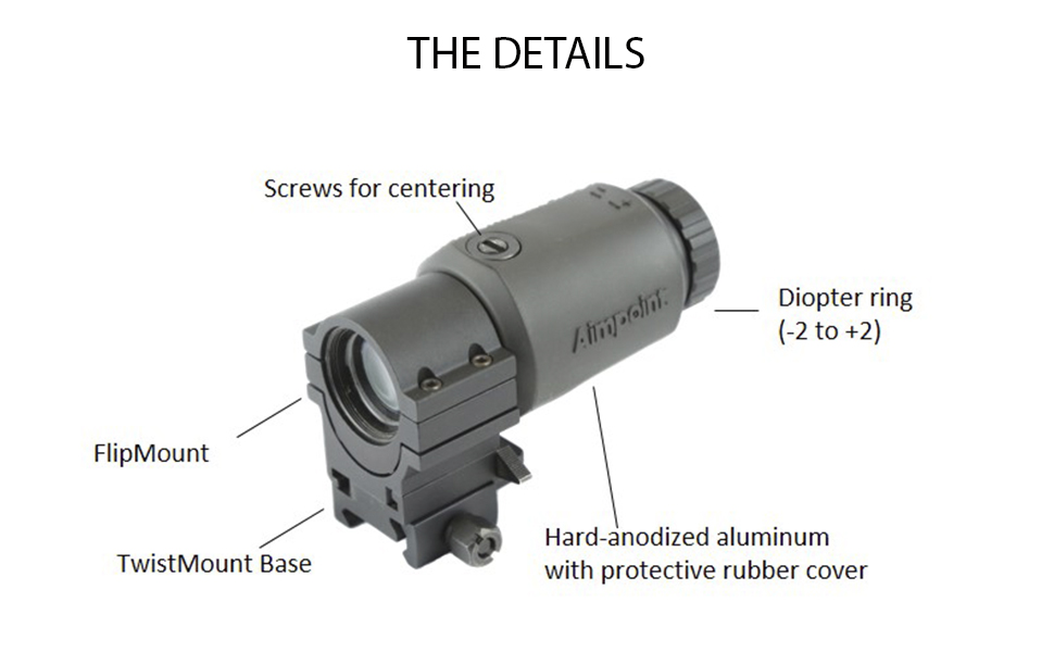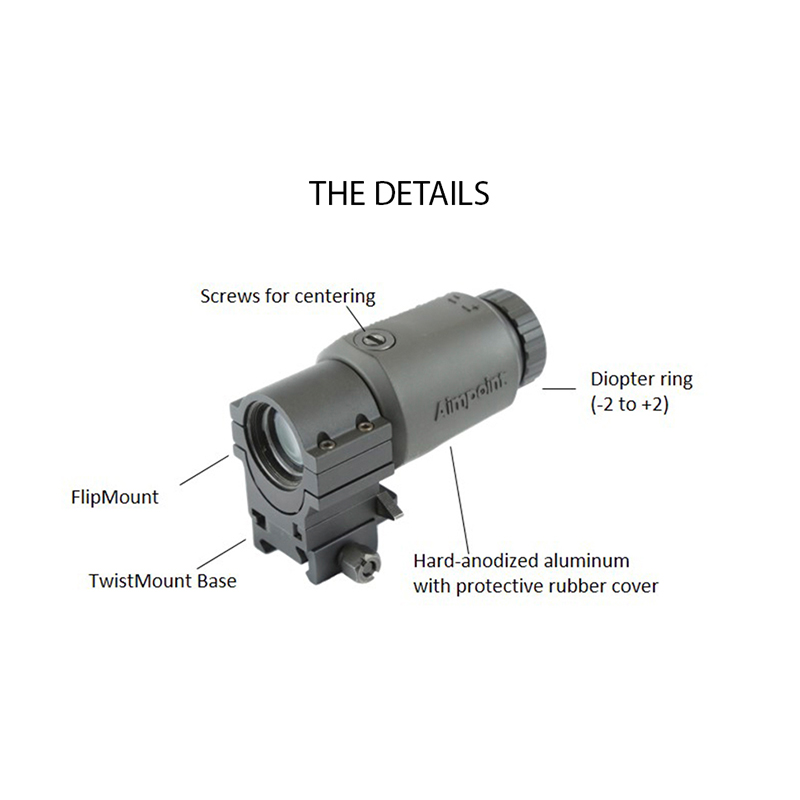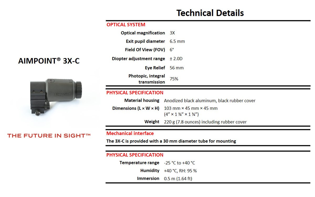 The Aimpoint® 3X-C Magnifier is a premium optic designed to increase capabilities for observation or target acquisition at longer distances. Whether it is paired with an Aimpoint red dot sight or used as a hand-held monocular, the 3X-C™ provides a crisp sight picture with a generous field of view. Utilizing the red dot in Aimpoint sights as the aiming reticle eliminates the need for re-zeroing when shifting between non-magnified and magnified aiming. This rugged magnifier module is fully waterproof and can withstand temperatures ranging from -31°F to +131°F. A shock absorbing protective rubber cover creates the ideal ergonomic grip when used as a hand-held device. Features include a 6-degree field of view (FOV) and a variable dioptric setting (-2 to +2), allowing the magnifier to be adjusted to the individual user’s eye. The 3X-C Magnifier can be used with Aimpoint Micro T-2/H-2 and Comp™ series sights. Offered at an entry level price point, the 3X-C is the ideal solution to increase your capabilities without sacrificing the advantage of extremely quick target acquisition.
