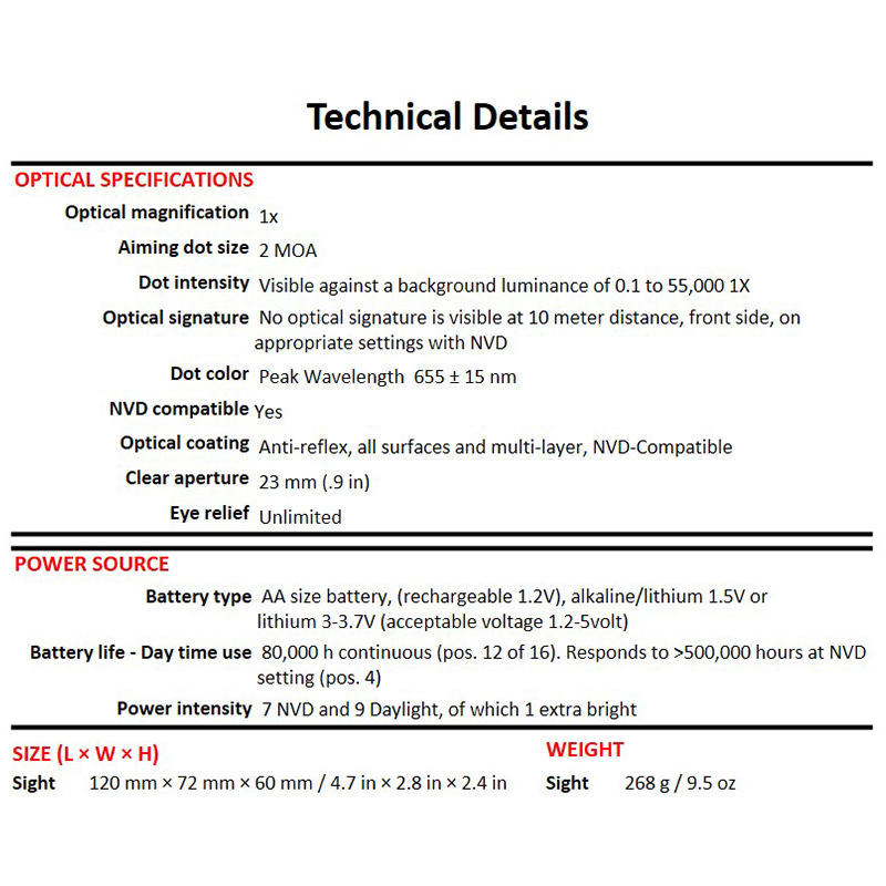 Aimpoint red dot sights are operationally parallax-free, which means the visible dot remains parallel to the bore of your weapon no matter what angle your eye is in relation to the sight. Therefore, the user never has to worry about centering the dot inside the sight. If you have a proper zero, when the dot is on the target, so are you. Aimpoint red dot sights increase confidence by allowing the shooter to focus on the target while keeping both eyes open, fully situationally aware at all times. Users can achieve first round hits faster with greater confidence.
