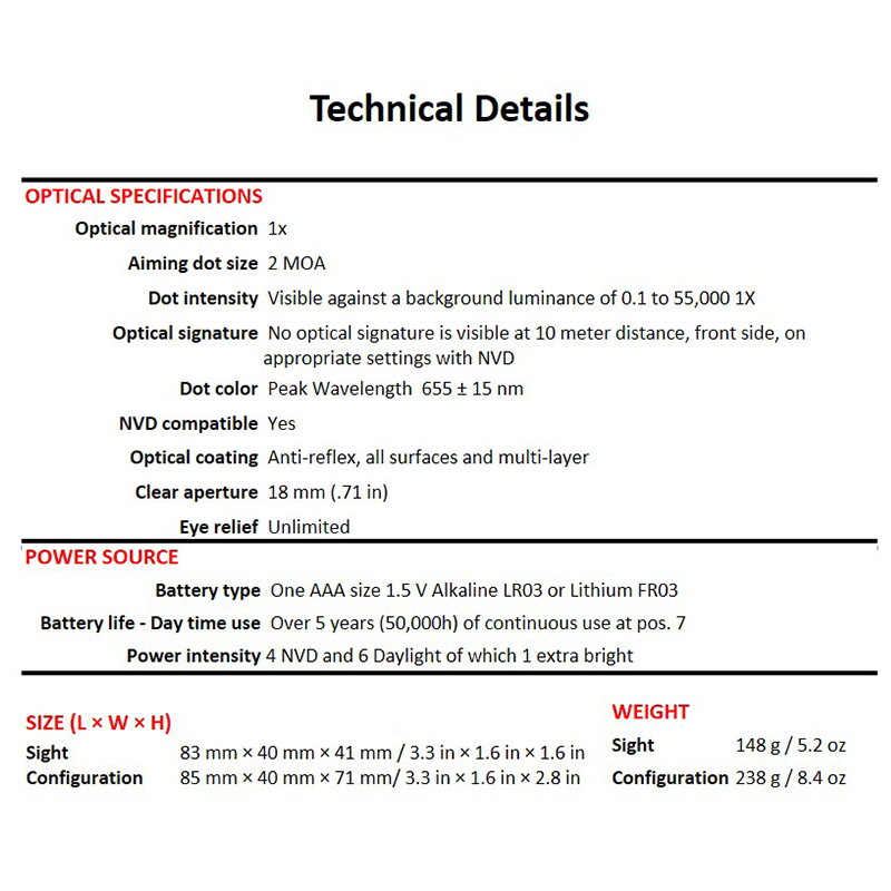 Aimpoint red dot sights are operationally parallax-free, which means the visible dot remains parallel to the bore of your weapon no matter what angle your eye is in relation to the sight. Therefore, the user never has to worry about centering the dot inside the sight. If you have a proper zero, when the dot is on the target, so are you. Aimpoint red dot sights increase confidence by allowing the shooter to focus on the target while keeping both eyes open, fully situationally aware at all times. Users can achieve first round hits faster with greater confidence.